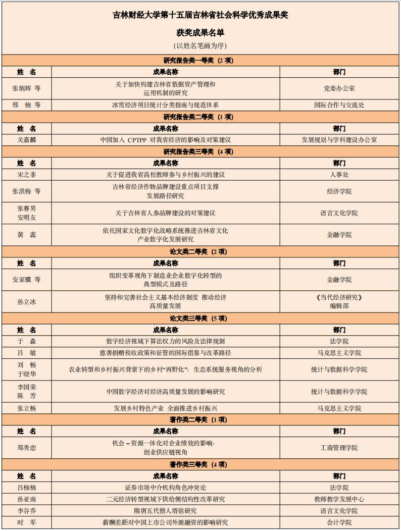 近日,中共吉林省委和吉林省人民政府发布了《关于表彰第十五届吉林省社会科学优秀成果奖获奖成果的决定》,我校凭借深厚的学科积淀与扎实的科研创新,在本次评选中表现突出,共斩获19项获奖成果,涵盖研究报告类一等奖2项、二等奖1项、三等奖4项;论文类二等奖2项、三等奖5项;著作类二等奖1项、三等奖4项。