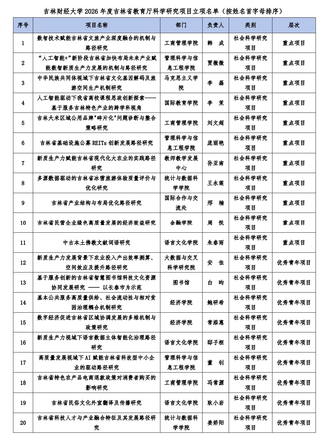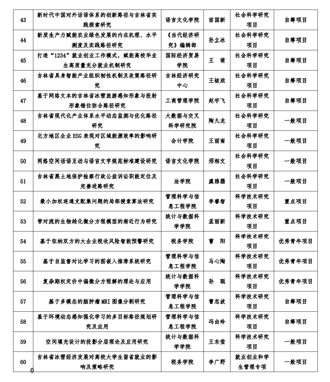 (本网讯 科研处供稿) 近日,吉林省教育厅公布了2026年度吉林省教育厅科学研究项目立项名单,我校共有60项课题获批立项。其中重点项目13项、一般项目6项、优秀青年项目26项、一般自筹项目15项。获批项目数量创历史新高。